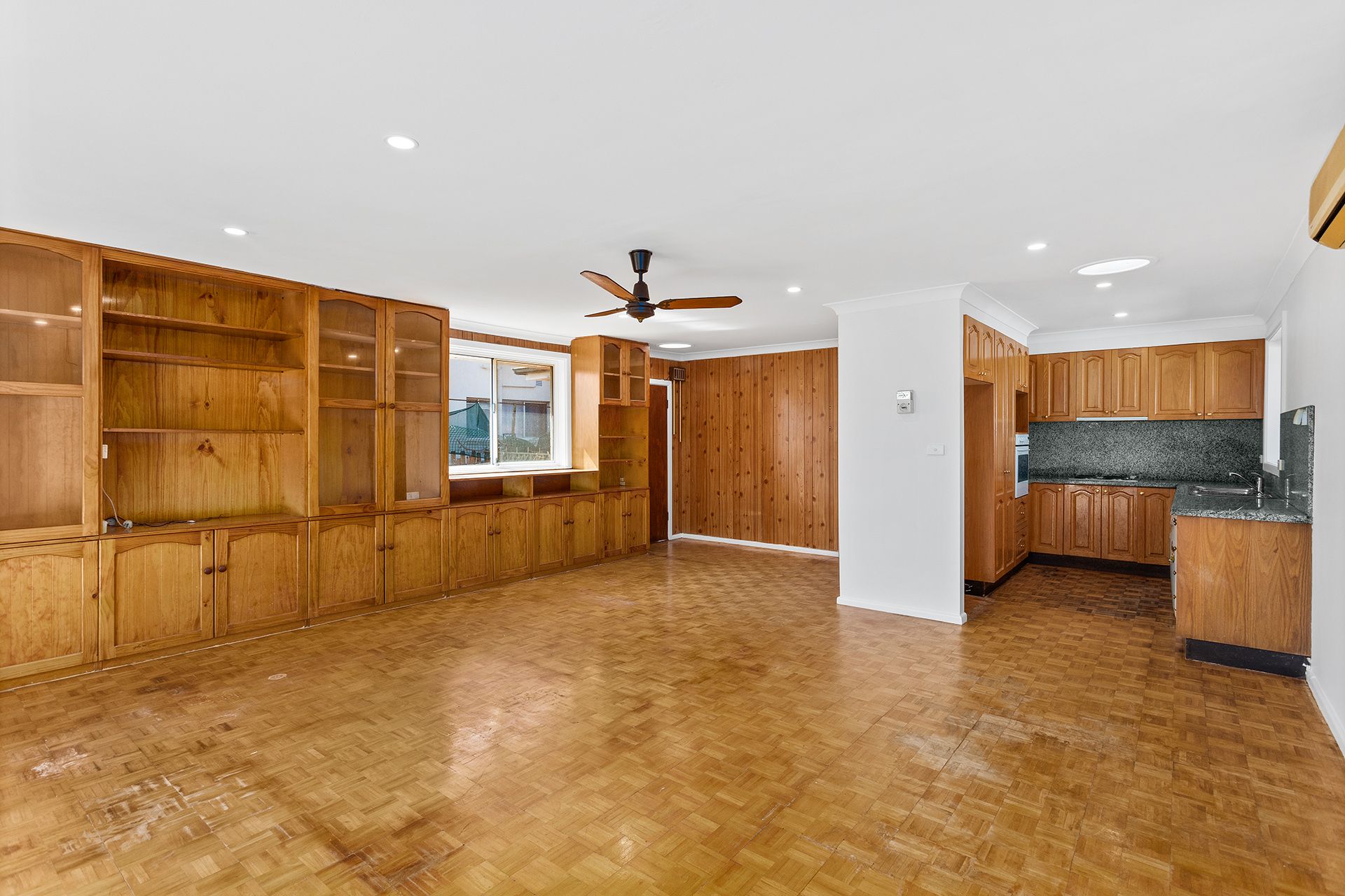 - Living Area with split air con system and a ceiling fan. In built storage along one of the walls