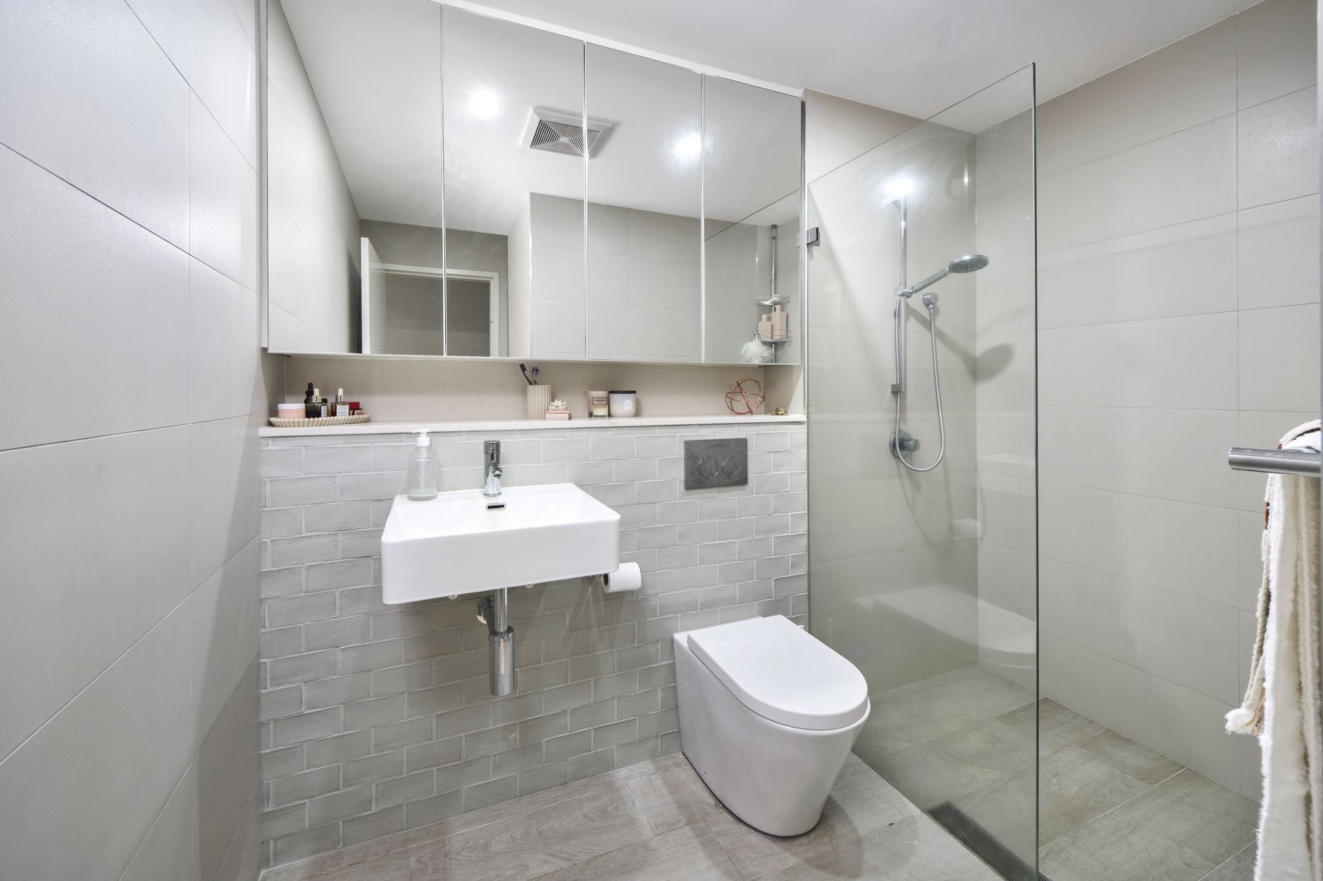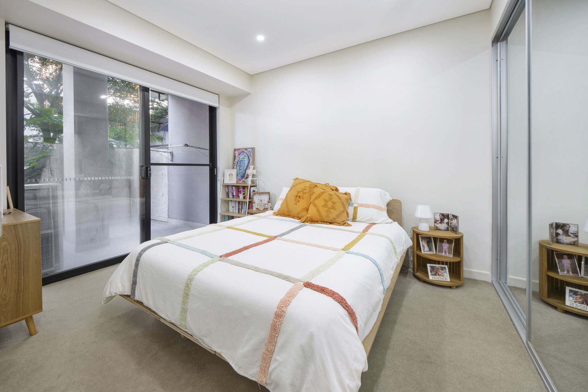 The unit boasts a generous bedroom with lush carpeting and built-in wardrobes. The main bathroom is equally well-appointed, offering both style and comfort.